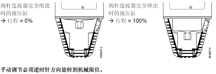 閥桿連接器完全縮進時的液壓缸行程 = 0%
